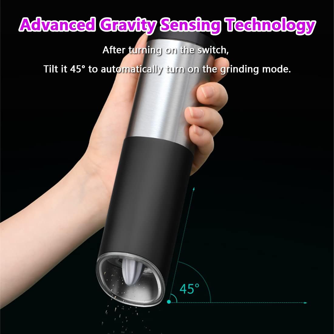 Gracias a su diseño avanzado con detección de gravedad, solo necesitas girar el molinillo para activar la molienda, ¡sin usar ambas manos! Perfecto para condimentar rápidamente con una sola mano y sin complicaciones.